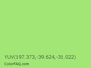 YUV 197.373,-39.624,-31.022 Color is a light green color and the nearest color is Feijoa #9fdd8c. Hex code #a2e775 and RGB value is rgb(162,231,117). In RGB color space, this color is composed of 64% red, 91% green, 46% blue, In CMYK color space, this color is composed of 30% cyan, 0% magenta, 49% yellow , 9% black , In HSL color space, this color has a hue angle of 96° , 70% saturation and 68% lightness.