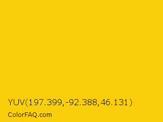 YUV 197.399,-92.388,46.131 Color is a normal yellow color and the nearest color is Tangerine Yellow #ffcc00. Hex code #facf0a and RGB value is rgb(250,207,10). In RGB color space, this color is composed of 98% red, 81% green, 4% blue, In CMYK color space, this color is composed of 0% cyan, 17% magenta, 96% yellow , 2% black , In HSL color space, this color has a hue angle of 49° , 96% saturation and 51% lightness.