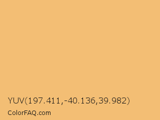 YUV 197.411,-40.136,39.982 Color is a light orange color and the nearest color is Mellow Apricot #f8b878. Hex code #f3be74 and RGB value is rgb(243,190,116). In RGB color space, this color is composed of 95% red, 75% green, 45% blue, In CMYK color space, this color is composed of 0% cyan, 22% magenta, 52% yellow , 5% black , In HSL color space, this color has a hue angle of 35° , 84% saturation and 70% lightness.