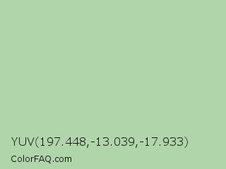 YUV 197.448,-13.039,-17.933 Color is a light green color and the nearest color is Moss Green #addfad. Hex code #b1d5ab and RGB value is rgb(177,213,171). In RGB color space, this color is composed of 69% red, 84% green, 67% blue, In CMYK color space, this color is composed of 17% cyan, 0% magenta, 20% yellow , 16% black , In HSL color space, this color has a hue angle of 111° , 33% saturation and 75% lightness.