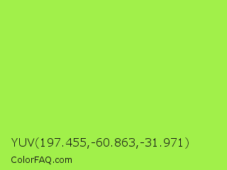 YUV 197.455,-60.863,-31.971 Color is a light green color and the nearest color is Conifer #acdd4d. Hex code #a1f04a and RGB value is rgb(161,240,74). In RGB color space, this color is composed of 63% red, 94% green, 29% blue, In CMYK color space, this color is composed of 33% cyan, 0% magenta, 69% yellow , 6% black , In HSL color space, this color has a hue angle of 89° , 85% saturation and 62% lightness.