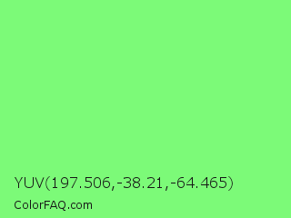 YUV 197.506,-38.21,-64.465 Color is a light green color and the nearest color is Screamin Green #66ff66. Hex code #7cfa78 and RGB value is rgb(124,250,120). In RGB color space, this color is composed of 49% red, 98% green, 47% blue, In CMYK color space, this color is composed of 50% cyan, 0% magenta, 52% yellow , 2% black , In HSL color space, this color has a hue angle of 118° , 93% saturation and 73% lightness.