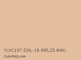 YUV 197.529,-18.995,25.846 Color is a light orange color and the nearest color is Cashmere #e6bea5. Hex code #e3be9f and RGB value is rgb(227,190,159). In RGB color space, this color is composed of 89% red, 75% green, 62% blue, In CMYK color space, this color is composed of 0% cyan, 16% magenta, 30% yellow , 11% black , In HSL color space, this color has a hue angle of 27° , 55% saturation and 76% lightness.