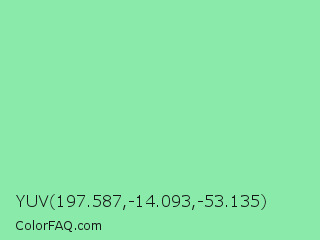 YUV 197.587,-14.093,-53.135 Color is a light green color and the nearest color is Teal Deer #99e6b3. Hex code #89eaa9 and RGB value is rgb(137,234,169). In RGB color space, this color is composed of 54% red, 92% green, 66% blue, In CMYK color space, this color is composed of 41% cyan, 0% magenta, 28% yellow , 8% black , In HSL color space, this color has a hue angle of 140° , 70% saturation and 73% lightness.