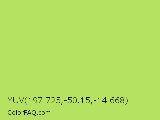 YUV 197.725,-50.15,-14.668 Color is a light green color and the nearest color is Inchworm #b2ec5d. Hex code #b5e260 and RGB value is rgb(181,226,96). In RGB color space, this color is composed of 71% red, 89% green, 38% blue, In CMYK color space, this color is composed of 20% cyan, 0% magenta, 58% yellow , 11% black , In HSL color space, this color has a hue angle of 81° , 69% saturation and 63% lightness.