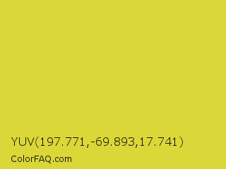 YUV 197.771,-69.893,17.741 Color is a normal yellow color and the nearest color is Wattle #dcd747. Hex code #dad738 and RGB value is rgb(218,215,56). In RGB color space, this color is composed of 85% red, 84% green, 22% blue, In CMYK color space, this color is composed of 0% cyan, 1% magenta, 74% yellow , 15% black , In HSL color space, this color has a hue angle of 59° , 69% saturation and 54% lightness.
