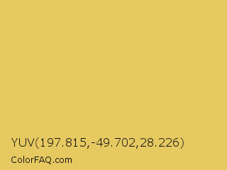 YUV 197.815,-49.702,28.226 Color is a light yellow color and the nearest color is Equator #e1bc64. Hex code #e6c961 and RGB value is rgb(230,201,97). In RGB color space, this color is composed of 90% red, 79% green, 38% blue, In CMYK color space, this color is composed of 0% cyan, 13% magenta, 58% yellow , 10% black , In HSL color space, this color has a hue angle of 47° , 73% saturation and 64% lightness.