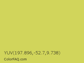 YUV 197.896,-52.7,9.738 Color is a normal yellow color and the nearest color is Tacha #d6c562. Hex code #d1d55b and RGB value is rgb(209,213,91). In RGB color space, this color is composed of 82% red, 84% green, 36% blue, In CMYK color space, this color is composed of 2% cyan, 0% magenta, 57% yellow , 16% black , In HSL color space, this color has a hue angle of 62° , 59% saturation and 60% lightness.