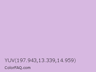 YUV 197.943,13.339,14.959 Color is a light purple color and the nearest color is Prelude #d0c0e5. Hex code #d7b8e1 and RGB value is rgb(215,184,225). In RGB color space, this color is composed of 84% red, 72% green, 88% blue, In CMYK color space, this color is composed of 4% cyan, 18% magenta, 0% yellow , 12% black , In HSL color space, this color has a hue angle of 285° , 41% saturation and 80% lightness.