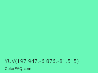 YUV 197.947,-6.876,-81.515 Color is a light green color and the nearest color is Medium Aquamarine #66ddaa. Hex code #69f8b8 and RGB value is rgb(105,248,184). In RGB color space, this color is composed of 41% red, 97% green, 72% blue, In CMYK color space, this color is composed of 58% cyan, 0% magenta, 26% yellow , 3% black , In HSL color space, this color has a hue angle of 153° , 91% saturation and 69% lightness.