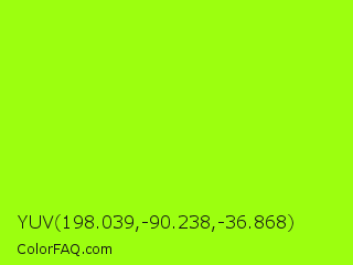 YUV 198.039,-90.238,-36.868 Color is a normal green color and the nearest color is Spring Bud #a7fc00. Hex code #9cff0f and RGB value is rgb(156,255,15). In RGB color space, this color is composed of 61% red, 100% green, 6% blue, In CMYK color space, this color is composed of 39% cyan, 0% magenta, 94% yellow , 0% black , In HSL color space, this color has a hue angle of 85° , 100% saturation and 53% lightness.