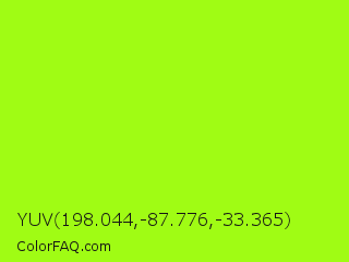 YUV 198.044,-87.776,-33.365 Color is a normal green color and the nearest color is Spring Bud #a7fc00. Hex code #a0fc14 and RGB value is rgb(160,252,20). In RGB color space, this color is composed of 63% red, 99% green, 8% blue, In CMYK color space, this color is composed of 37% cyan, 0% magenta, 92% yellow , 1% black , In HSL color space, this color has a hue angle of 84° , 97% saturation and 53% lightness.