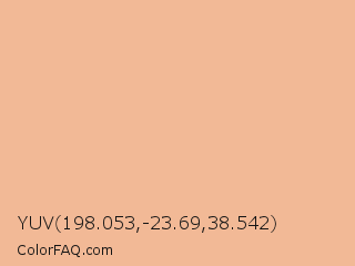 YUV 198.053,-23.69,38.542 Color is a light orange color and the nearest color is Manhattan #f5c999. Hex code #f2b996 and RGB value is rgb(242,185,150). In RGB color space, this color is composed of 95% red, 73% green, 59% blue, In CMYK color space, this color is composed of 0% cyan, 24% magenta, 38% yellow , 5% black , In HSL color space, this color has a hue angle of 23° , 78% saturation and 77% lightness.