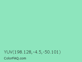 YUV 198.128,-4.5,-50.101 Color is a light green color and the nearest color is Algae Green #93dfb8. Hex code #8de5bd and RGB value is rgb(141,229,189). In RGB color space, this color is composed of 55% red, 90% green, 74% blue, In CMYK color space, this color is composed of 38% cyan, 0% magenta, 17% yellow , 10% black , In HSL color space, this color has a hue angle of 153° , 63% saturation and 73% lightness.