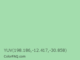 YUV 198.186,-12.417,-30.858 Color is a light green color and the nearest color is Celadon #ace1af. Hex code #a3ddad and RGB value is rgb(163,221,173). In RGB color space, this color is composed of 64% red, 87% green, 68% blue, In CMYK color space, this color is composed of 26% cyan, 0% magenta, 22% yellow , 13% black , In HSL color space, this color has a hue angle of 130° , 46% saturation and 75% lightness.