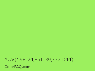 YUV 198.24,-51.39,-37.044 Color is a light green color and the nearest color is Inchworm #b2ec5d. Hex code #9cf05e and RGB value is rgb(156,240,94). In RGB color space, this color is composed of 61% red, 94% green, 37% blue, In CMYK color space, this color is composed of 35% cyan, 0% magenta, 61% yellow , 6% black , In HSL color space, this color has a hue angle of 95° , 83% saturation and 65% lightness.