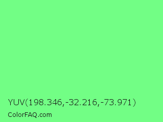 YUV 198.346,-32.216,-73.971 Color is a light green color and the nearest color is Very Light Malachite Green #64e986. Hex code #72fe85 and RGB value is rgb(114,254,133). In RGB color space, this color is composed of 45% red, 100% green, 52% blue, In CMYK color space, this color is composed of 55% cyan, 0% magenta, 48% yellow , 0% black , In HSL color space, this color has a hue angle of 128° , 99% saturation and 72% lightness.