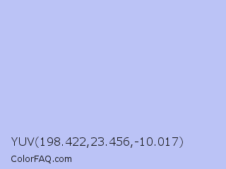 YUV 198.422,23.456,-10.017 Color is a very light blue color and the nearest color is Melrose #c7c1ff. Hex code #bbc3f6 and RGB value is rgb(187,195,246). In RGB color space, this color is composed of 73% red, 76% green, 96% blue, In CMYK color space, this color is composed of 24% cyan, 21% magenta, 0% yellow , 4% black , In HSL color space, this color has a hue angle of 232° , 77% saturation and 85% lightness.
