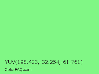 YUV 198.423,-32.254,-61.761 Color is a light green color and the nearest color is Light Green #90ee90. Hex code #80f785 and RGB value is rgb(128,247,133). In RGB color space, this color is composed of 50% red, 97% green, 52% blue, In CMYK color space, this color is composed of 48% cyan, 0% magenta, 46% yellow , 3% black , In HSL color space, this color has a hue angle of 123° , 88% saturation and 74% lightness.