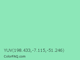 YUV 198.433,-7.115,-51.246 Color is a light green color and the nearest color is Algae Green #93dfb8. Hex code #8ce7b8 and RGB value is rgb(140,231,184). In RGB color space, this color is composed of 55% red, 91% green, 72% blue, In CMYK color space, this color is composed of 39% cyan, 0% magenta, 20% yellow , 9% black , In HSL color space, this color has a hue angle of 149° , 65% saturation and 73% lightness.
