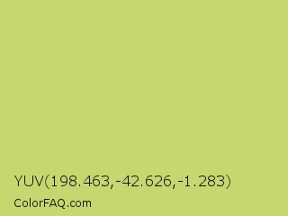 YUV 198.463,-42.626,-1.283 Color is a light lime color and the nearest color is Yellow Green #c5e17a. Hex code #c5d870 and RGB value is rgb(197,216,112). In RGB color space, this color is composed of 77% red, 85% green, 44% blue, In CMYK color space, this color is composed of 9% cyan, 0% magenta, 48% yellow , 15% black , In HSL color space, this color has a hue angle of 71° , 57% saturation and 64% lightness.