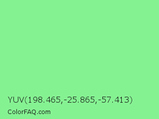 YUV 198.465,-25.865,-57.413 Color is a light green color and the nearest color is Light Green #90ee90. Hex code #85f292 and RGB value is rgb(133,242,146). In RGB color space, this color is composed of 52% red, 95% green, 57% blue, In CMYK color space, this color is composed of 45% cyan, 0% magenta, 40% yellow , 5% black , In HSL color space, this color has a hue angle of 127° , 81% saturation and 74% lightness.