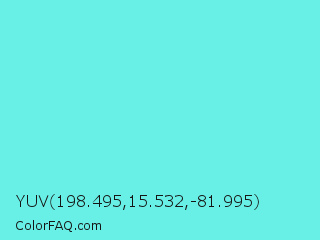 YUV 198.495,15.532,-81.995 Color is a light cyan color and the nearest color is Turquoise Blue #6cdae7. Hex code #69f0e6 and RGB value is rgb(105,240,230). In RGB color space, this color is composed of 41% red, 94% green, 90% blue, In CMYK color space, this color is composed of 56% cyan, 0% magenta, 4% yellow , 6% black , In HSL color space, this color has a hue angle of 176° , 82% saturation and 68% lightness.