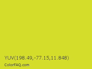 YUV 198.49,-77.15,11.848 Color is a normal yellow color and the nearest color is Pear #d1e231. Hex code #d4de2a and RGB value is rgb(212,222,42). In RGB color space, this color is composed of 83% red, 87% green, 16% blue, In CMYK color space, this color is composed of 5% cyan, 0% magenta, 81% yellow , 13% black , In HSL color space, this color has a hue angle of 63° , 73% saturation and 52% lightness.