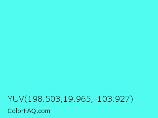 YUV 198.503,19.965,-103.927 Color is a light cyan color and the nearest color is Turquoise Blue #6cdae7. Hex code #50fbef and RGB value is rgb(80,251,239). In RGB color space, this color is composed of 31% red, 98% green, 94% blue, In CMYK color space, this color is composed of 68% cyan, 0% magenta, 5% yellow , 2% black , In HSL color space, this color has a hue angle of 176° , 96% saturation and 65% lightness.