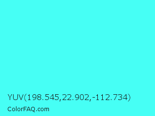 YUV 198.545,22.902,-112.734 Color is a light cyan color and the nearest color is Turquoise #40e0d0. Hex code #46fff5 and RGB value is rgb(70,255,245). In RGB color space, this color is composed of 27% red, 100% green, 96% blue, In CMYK color space, this color is composed of 73% cyan, 0% magenta, 4% yellow , 0% black , In HSL color space, this color has a hue angle of 177° , 100% saturation and 64% lightness.