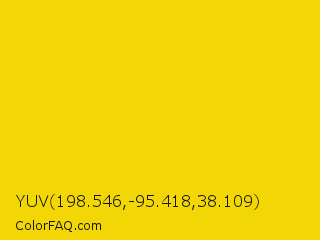 YUV 198.546,-95.418,38.109 Color is a normal yellow color and the nearest color is Safety Yellow #eed202. Hex code #f2d605 and RGB value is rgb(242,214,5). In RGB color space, this color is composed of 95% red, 84% green, 2% blue, In CMYK color space, this color is composed of 0% cyan, 12% magenta, 98% yellow , 5% black , In HSL color space, this color has a hue angle of 53° , 96% saturation and 48% lightness.