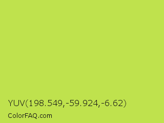 YUV 198.549,-59.924,-6.62 Color is a normal lime color and the nearest color is June Bud #bdda57. Hex code #bfe24d and RGB value is rgb(191,226,77). In RGB color space, this color is composed of 75% red, 89% green, 30% blue, In CMYK color space, this color is composed of 15% cyan, 0% magenta, 66% yellow , 11% black , In HSL color space, this color has a hue angle of 74° , 72% saturation and 59% lightness.