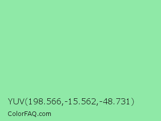 YUV 198.566,-15.562,-48.731 Color is a light green color and the nearest color is Teal Deer #99e6b3. Hex code #8fe9a7 and RGB value is rgb(143,233,167). In RGB color space, this color is composed of 56% red, 91% green, 65% blue, In CMYK color space, this color is composed of 39% cyan, 0% magenta, 28% yellow , 9% black , In HSL color space, this color has a hue angle of 136° , 67% saturation and 74% lightness.
