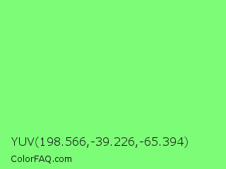 YUV 198.566,-39.226,-65.394 Color is a light green color and the nearest color is Screamin Green #66ff66. Hex code #7cfc77 and RGB value is rgb(124,252,119). In RGB color space, this color is composed of 49% red, 99% green, 47% blue, In CMYK color space, this color is composed of 51% cyan, 0% magenta, 53% yellow , 1% black , In HSL color space, this color has a hue angle of 118° , 96% saturation and 73% lightness.