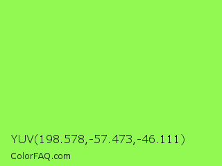 YUV 198.578,-57.473,-46.111 Color is a light green color and the nearest color is Kiwi #8ee53f. Hex code #92f852 and RGB value is rgb(146,248,82). In RGB color space, this color is composed of 57% red, 97% green, 32% blue, In CMYK color space, this color is composed of 41% cyan, 0% magenta, 67% yellow , 3% black , In HSL color space, this color has a hue angle of 97° , 92% saturation and 65% lightness.