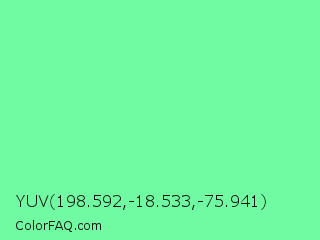 YUV 198.592,-18.533,-75.941 Color is a light green color and the nearest color is Medium Aquamarine #66ddaa. Hex code #70faa1 and RGB value is rgb(112,250,161). In RGB color space, this color is composed of 44% red, 98% green, 63% blue, In CMYK color space, this color is composed of 55% cyan, 0% magenta, 36% yellow , 2% black , In HSL color space, this color has a hue angle of 141° , 93% saturation and 71% lightness.