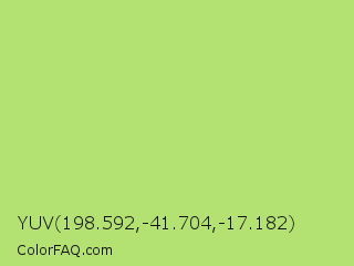 YUV 198.592,-41.704,-17.182 Color is a light green color and the nearest color is Yellow Green #c5e17a. Hex code #b3e172 and RGB value is rgb(179,225,114). In RGB color space, this color is composed of 70% red, 88% green, 45% blue, In CMYK color space, this color is composed of 20% cyan, 0% magenta, 49% yellow , 12% black , In HSL color space, this color has a hue angle of 85° , 65% saturation and 66% lightness.
