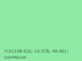 YUV 198.626,-16.578,-49.661 Color is a light green color and the nearest color is Teal Deer #99e6b3. Hex code #8eeaa5 and RGB value is rgb(142,234,165). In RGB color space, this color is composed of 56% red, 92% green, 65% blue, In CMYK color space, this color is composed of 39% cyan, 0% magenta, 29% yellow , 8% black , In HSL color space, this color has a hue angle of 135° , 69% saturation and 74% lightness.