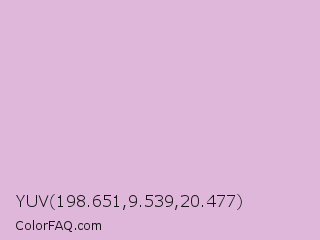 YUV 198.651,9.539,20.477 Color is a light magenta color and the nearest color is Thistle #d8bfd8. Hex code #deb7da and RGB value is rgb(222,183,218). In RGB color space, this color is composed of 87% red, 72% green, 85% blue, In CMYK color space, this color is composed of 0% cyan, 18% magenta, 2% yellow , 13% black , In HSL color space, this color has a hue angle of 306° , 37% saturation and 79% lightness.