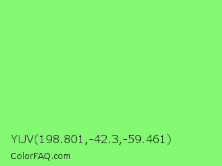 YUV 198.801,-42.3,-59.461 Color is a light green color and the nearest color is Screamin Green #66ff66. Hex code #83fa71 and RGB value is rgb(131,250,113). In RGB color space, this color is composed of 51% red, 98% green, 44% blue, In CMYK color space, this color is composed of 48% cyan, 0% magenta, 55% yellow , 2% black , In HSL color space, this color has a hue angle of 112° , 93% saturation and 71% lightness.