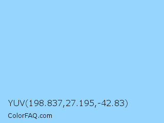 YUV 198.837,27.195,-42.83 Color is a light blue color and the nearest color is Pale Cyan #87d3f8. Hex code #96d5fe and RGB value is rgb(150,213,254). In RGB color space, this color is composed of 59% red, 84% green, 100% blue, In CMYK color space, this color is composed of 41% cyan, 16% magenta, 0% yellow , 0% black , In HSL color space, this color has a hue angle of 204° , 98% saturation and 79% lightness.