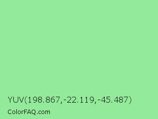 YUV 198.867,-22.119,-45.487 Color is a light green color and the nearest color is Light Green #90ee90. Hex code #93ea9a and RGB value is rgb(147,234,154). In RGB color space, this color is composed of 58% red, 92% green, 60% blue, In CMYK color space, this color is composed of 37% cyan, 0% magenta, 34% yellow , 8% black , In HSL color space, this color has a hue angle of 125° , 67% saturation and 75% lightness.