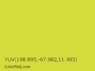 YUV 198.895,-67.982,11.493 Color is a normal yellow color and the nearest color is Wattle #dcd747. Hex code #d4db3d and RGB value is rgb(212,219,61). In RGB color space, this color is composed of 83% red, 86% green, 24% blue, In CMYK color space, this color is composed of 3% cyan, 0% magenta, 72% yellow , 14% black , In HSL color space, this color has a hue angle of 63° , 69% saturation and 55% lightness.
