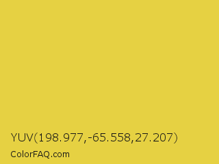 YUV 198.977,-65.558,27.207 Color is a normal yellow color and the nearest color is Sandstorm #ecd540. Hex code #e6d142 and RGB value is rgb(230,209,66). In RGB color space, this color is composed of 90% red, 82% green, 26% blue, In CMYK color space, this color is composed of 0% cyan, 9% magenta, 71% yellow , 10% black , In HSL color space, this color has a hue angle of 52° , 77% saturation and 58% lightness.
