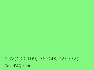 YUV 199.109,-36.043,-59.732 Color is a light green color and the nearest color is Light Green #90ee90. Hex code #83f87e and RGB value is rgb(131,248,126). In RGB color space, this color is composed of 51% red, 97% green, 49% blue, In CMYK color space, this color is composed of 47% cyan, 0% magenta, 49% yellow , 3% black , In HSL color space, this color has a hue angle of 118° , 90% saturation and 73% lightness.