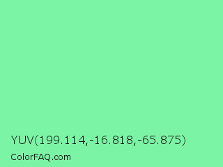 YUV 199.114,-16.818,-65.875 Color is a light green color and the nearest color is Light Green #90ee90. Hex code #7cf4a5 and RGB value is rgb(124,244,165). In RGB color space, this color is composed of 49% red, 96% green, 65% blue, In CMYK color space, this color is composed of 49% cyan, 0% magenta, 32% yellow , 4% black , In HSL color space, this color has a hue angle of 141° , 85% saturation and 72% lightness.