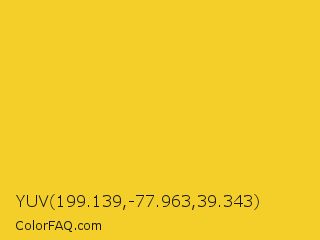 YUV 199.139,-77.963,39.343 Color is a normal yellow color and the nearest color is Golden Dream #f0d52d. Hex code #f4cf29 and RGB value is rgb(244,207,41). In RGB color space, this color is composed of 96% red, 81% green, 16% blue, In CMYK color space, this color is composed of 0% cyan, 15% magenta, 83% yellow , 4% black , In HSL color space, this color has a hue angle of 49° , 90% saturation and 56% lightness.