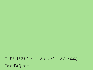 YUV 199.179,-25.231,-27.344 Color is a light green color and the nearest color is Granny Smith Apple Crayola #9de093. Hex code #a8e194 and RGB value is rgb(168,225,148). In RGB color space, this color is composed of 66% red, 88% green, 58% blue, In CMYK color space, this color is composed of 25% cyan, 0% magenta, 34% yellow , 12% black , In HSL color space, this color has a hue angle of 104° , 56% saturation and 73% lightness.