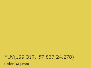 YUV 199.317,-57.837,24.278 Color is a light yellow color and the nearest color is Confetti #e9d75a. Hex code #e3d052 and RGB value is rgb(227,208,82). In RGB color space, this color is composed of 89% red, 82% green, 32% blue, In CMYK color space, this color is composed of 0% cyan, 8% magenta, 64% yellow , 11% black , In HSL color space, this color has a hue angle of 52° , 72% saturation and 61% lightness.