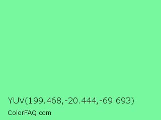 YUV 199.468,-20.444,-69.693 Color is a light green color and the nearest color is Light Green #90ee90. Hex code #78f89e and RGB value is rgb(120,248,158). In RGB color space, this color is composed of 47% red, 97% green, 62% blue, In CMYK color space, this color is composed of 52% cyan, 0% magenta, 36% yellow , 3% black , In HSL color space, this color has a hue angle of 138° , 90% saturation and 72% lightness.